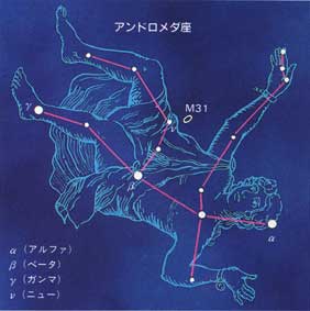 秋の代表的星座アンドロメダ座 この星座の中心は北東に伸びる3っつの2等星であるその2番目のベータ星から上の方へ小さな星を2つ数えるとM31が見つかる |