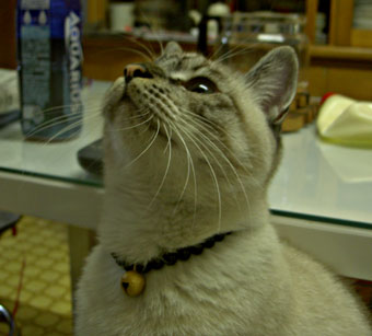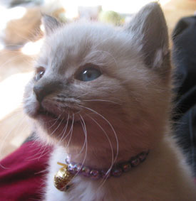 ひげがカールしてる・シッポがボンボンみたいに丸い・顔手足シッポが少しトラ模様が入っている。目は薄いブルー
